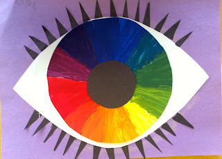 It wouldn't be art class without the good ol' color wheel. The 6th grade first class was spent drawing the wheel and dividing into 12 even sections. Then the student was given the primary colors, red, blue and yellow. From there the secondary and intermediate colors were mixed. I'm becoming the believer that the true primary colors are CMYK. I may have to have the students prove this for me. I do however love the way these came out as an eyeball.